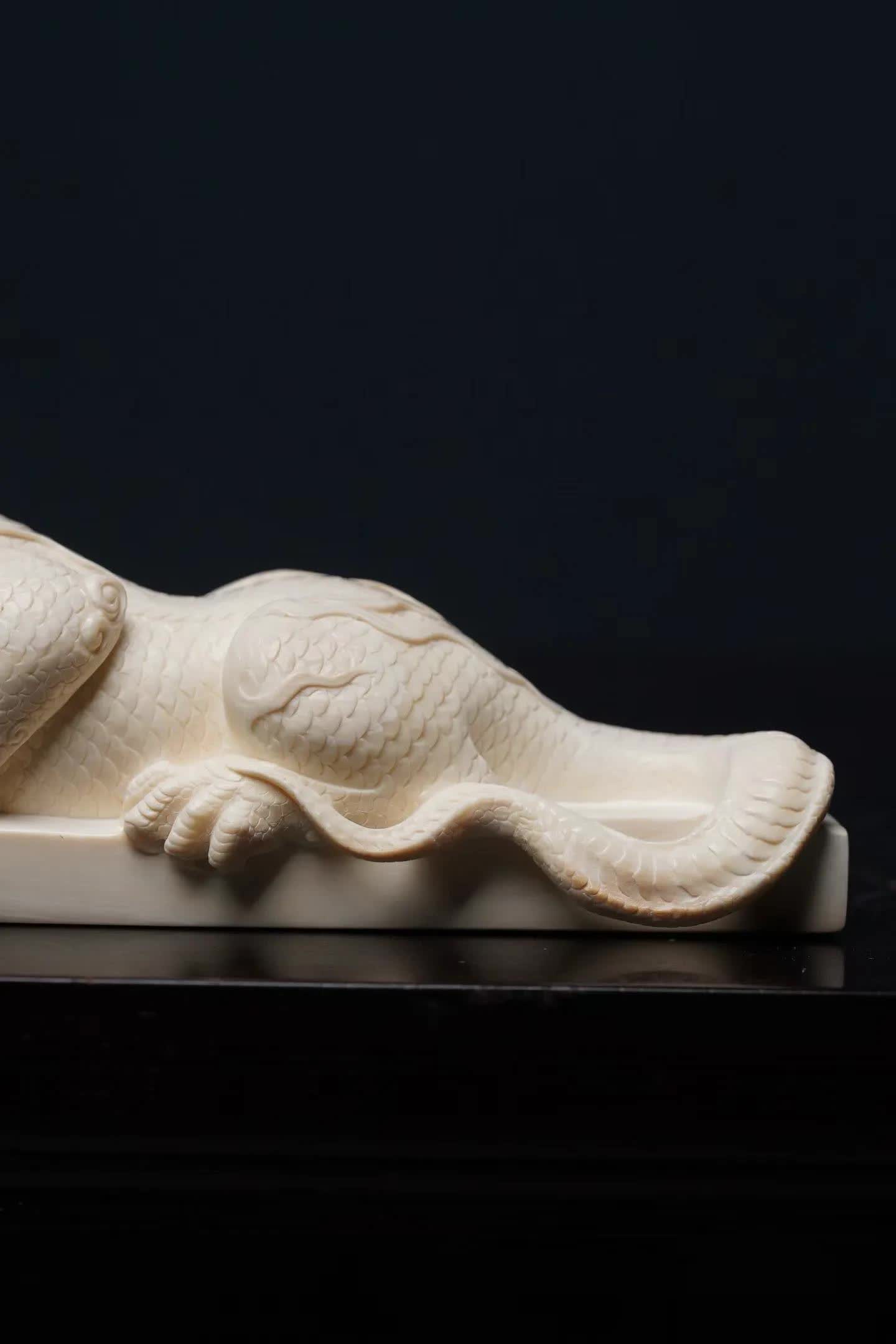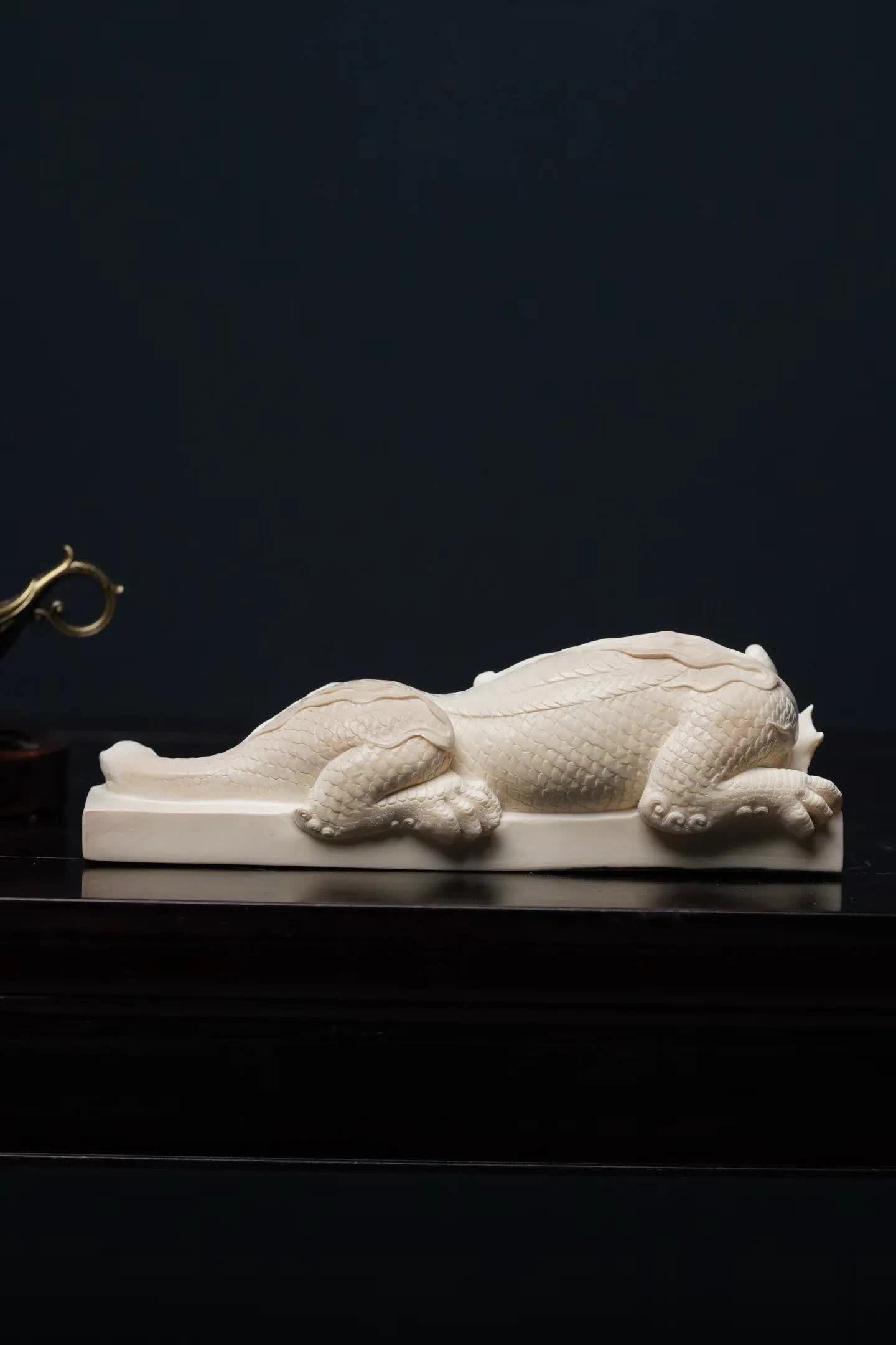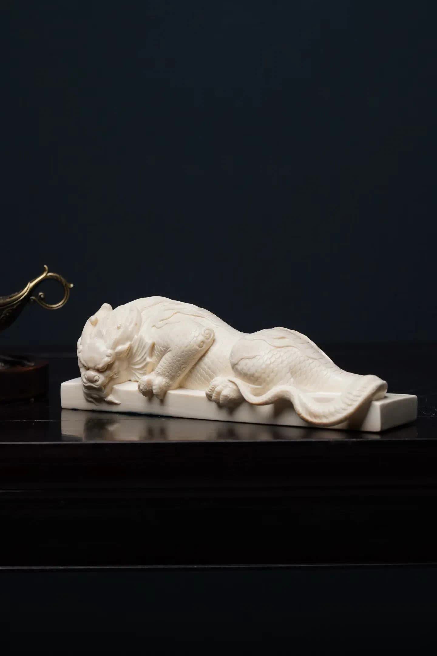 在中国传统瑞兽文化中,龙生九子开云体育,各有所司。其中有一种与水计划的神兽——蚣蝮,又被称为“避水兽”。古东说念主服气它能镇水御灾,因此在成就、器物和雕镂中常能见到它的身影。 这件作品以猛犸象牙手工雕镂而成。牙质空洞温润,色泽洁净柔软,在明后下呈现出一种柔软而舒畅的质感。整件作品通体一体雕成,质感白皙,显得额外淡雅。 从造型上看,避水兽仰卧于长形底座之上。头生小角,情愫威严而千里稳;前爪紧扣基座,仿佛随时蓄势而动。形体修长,背部龙鳞层层铺展,纹理明晰精致。尾部当然延展,酿成一种流动的线条节拍,