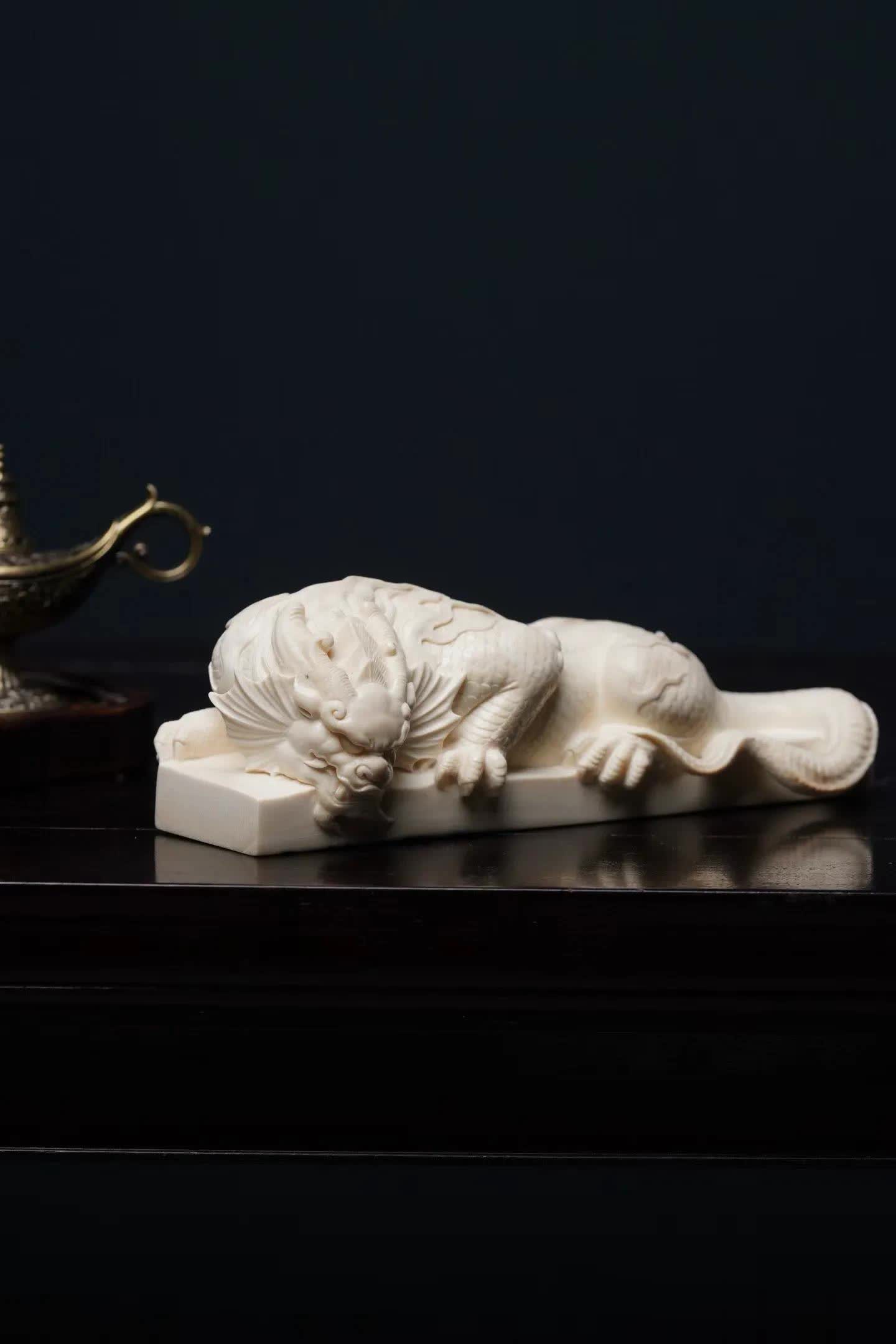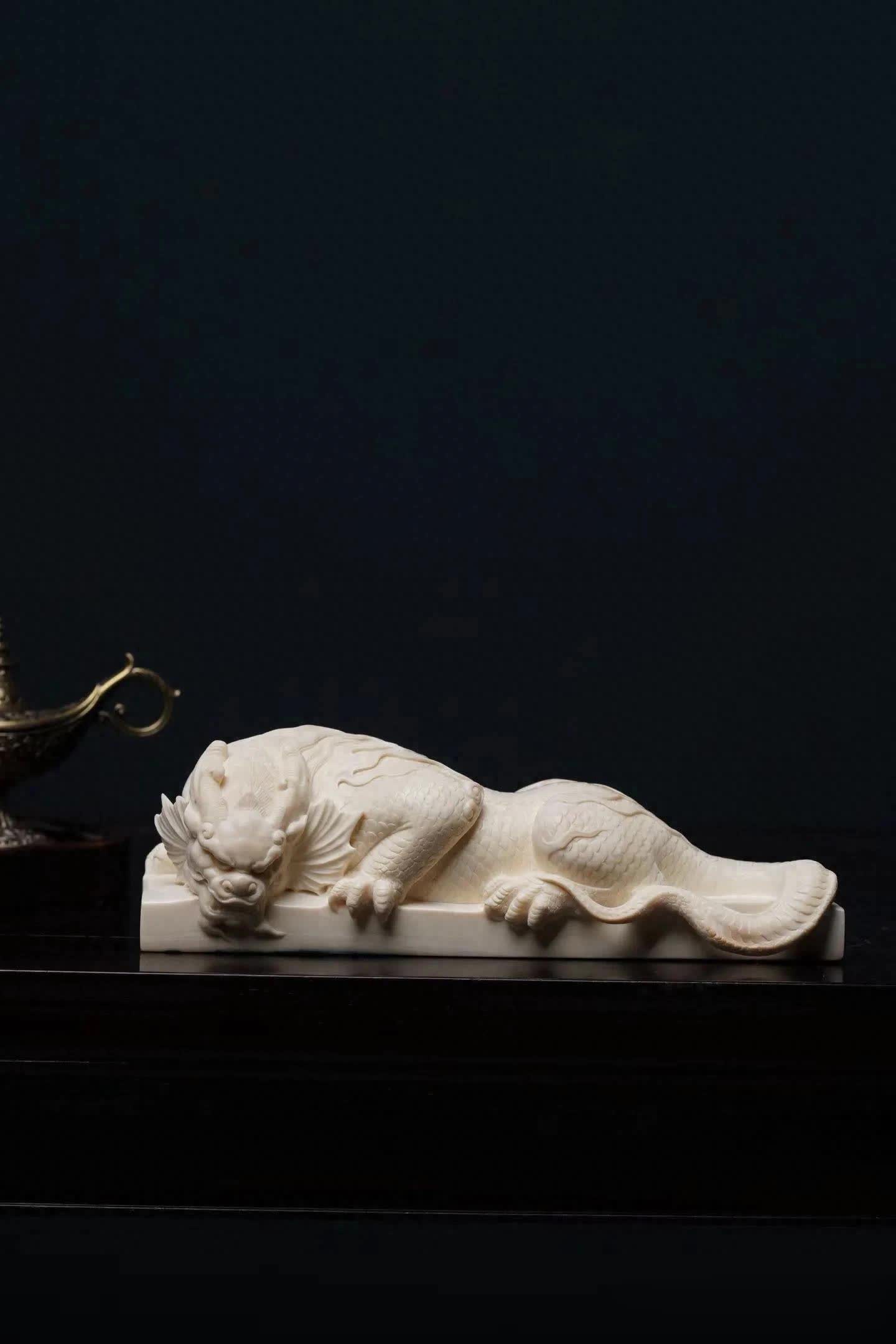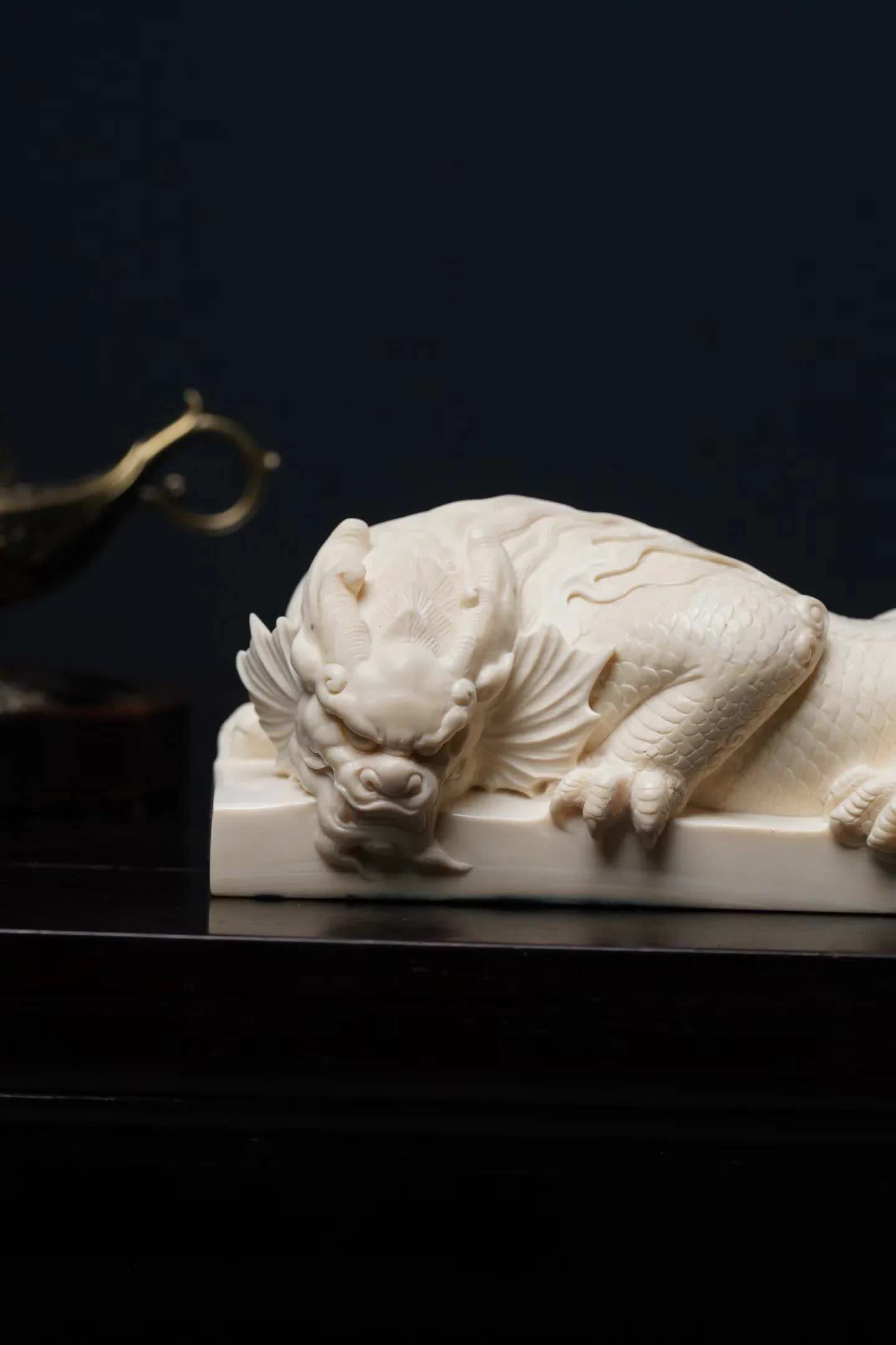 在中国传统瑞兽文化中,龙生九子开云体育,各有所司。其中有一种与水计划的神兽——蚣蝮,又被称为“避水兽”。古东说念主服气它能镇水御灾,因此在成就、器物和雕镂中常能见到它的身影。 这件作品以猛犸象牙手工雕镂而成。牙质空洞温润,色泽洁净柔软,在明后下呈现出一种柔软而舒畅的质感。整件作品通体一体雕成,质感白皙,显得额外淡雅。 从造型上看,避水兽仰卧于长形底座之上。头生小角,情愫威严而千里稳;前爪紧扣基座,仿佛随时蓄势而动。形体修长,背部龙鳞层层铺展,纹理明晰精致。尾部当然延展,酿成一种流动的线条节拍,