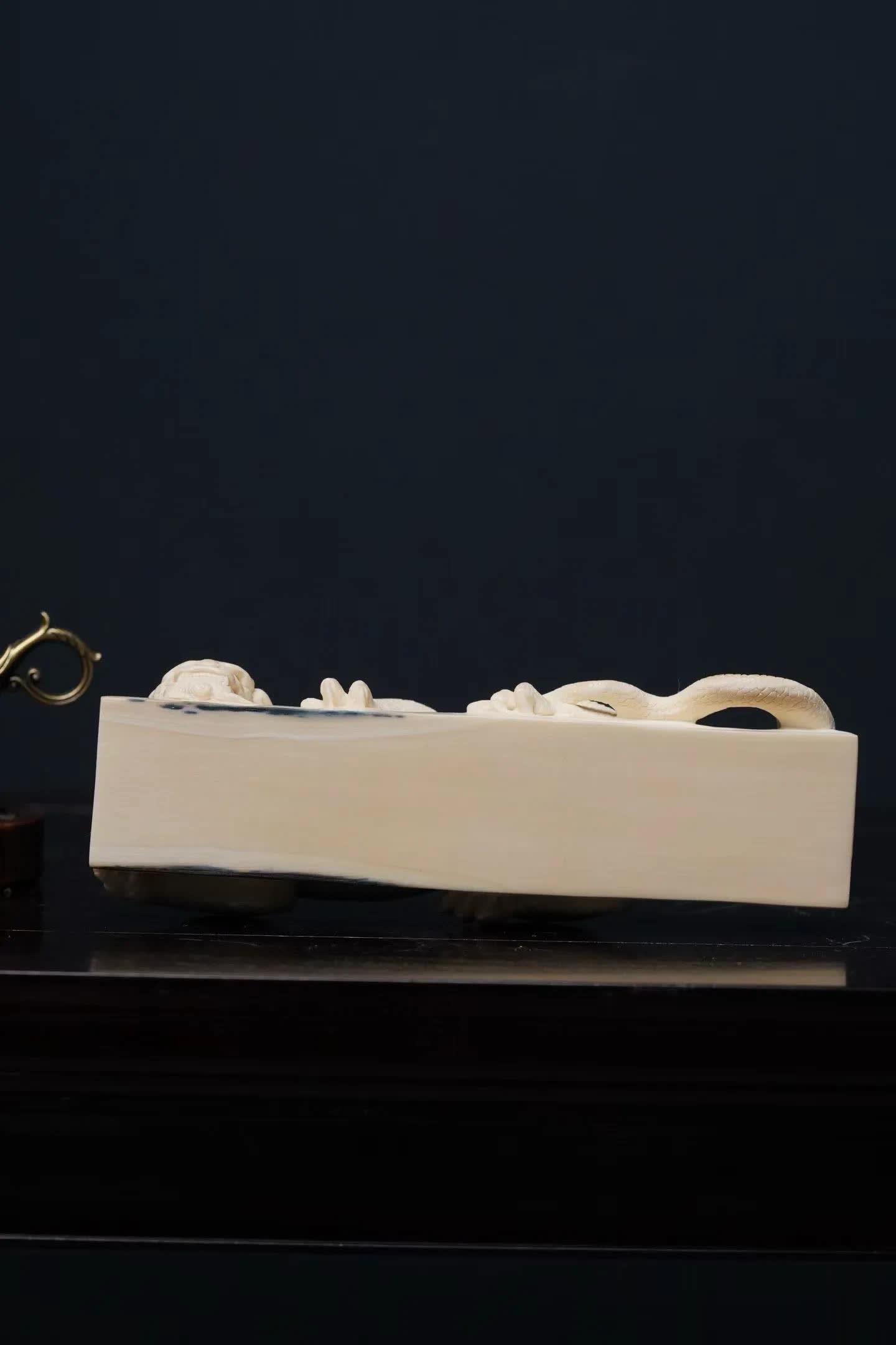 这件作品以猛犸象牙手工雕镂而成。牙质空洞温润,色泽洁净柔软,在明后下呈现出一种柔软而舒畅的质感。整件作品通体一体雕成,质感白皙,显得额外淡雅。